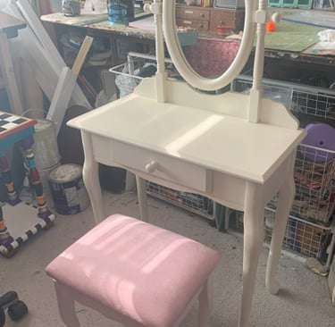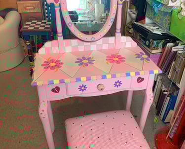 This piece I found in a thrift store. It was screaming for a transformation! Some funky pink patterns & flowers on the table top, a fully lined drawer just for fun, and new fabric on the chair -- and now it's the perfect piece as every little girl's dream!